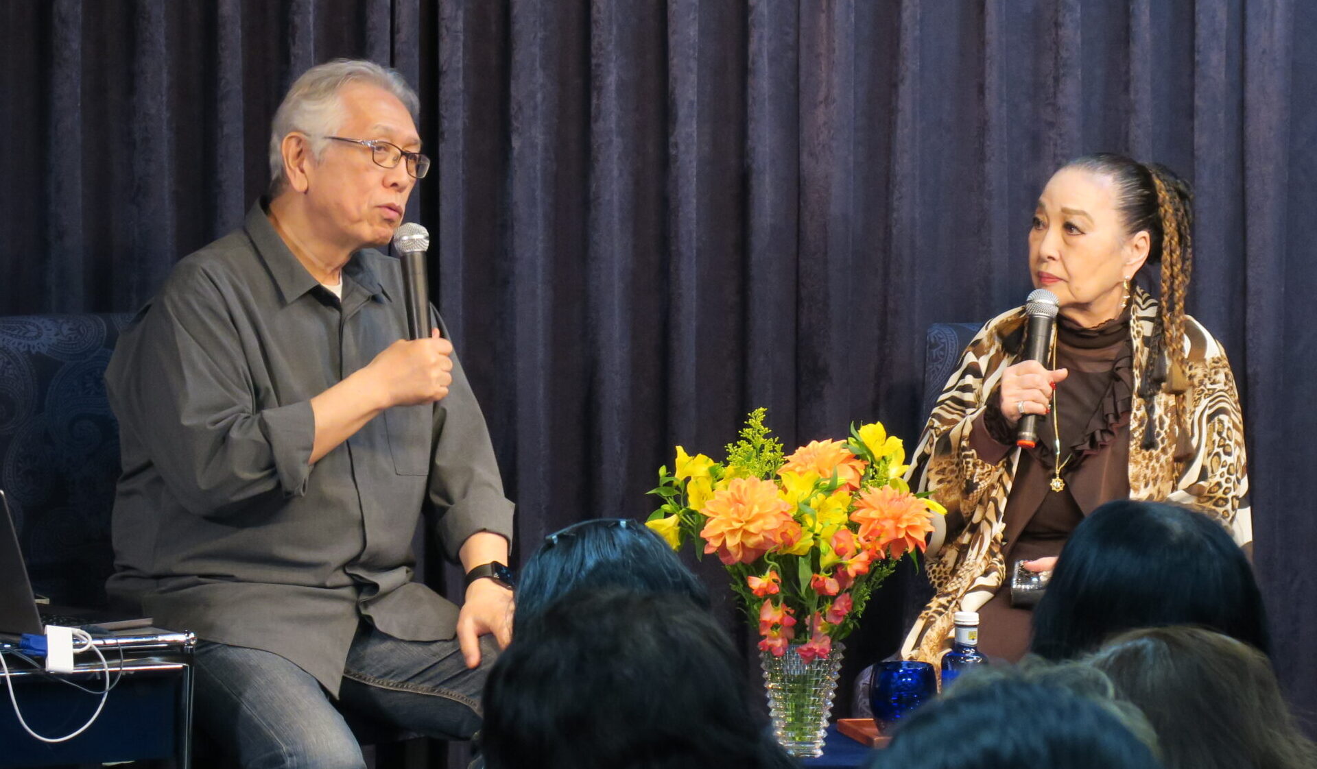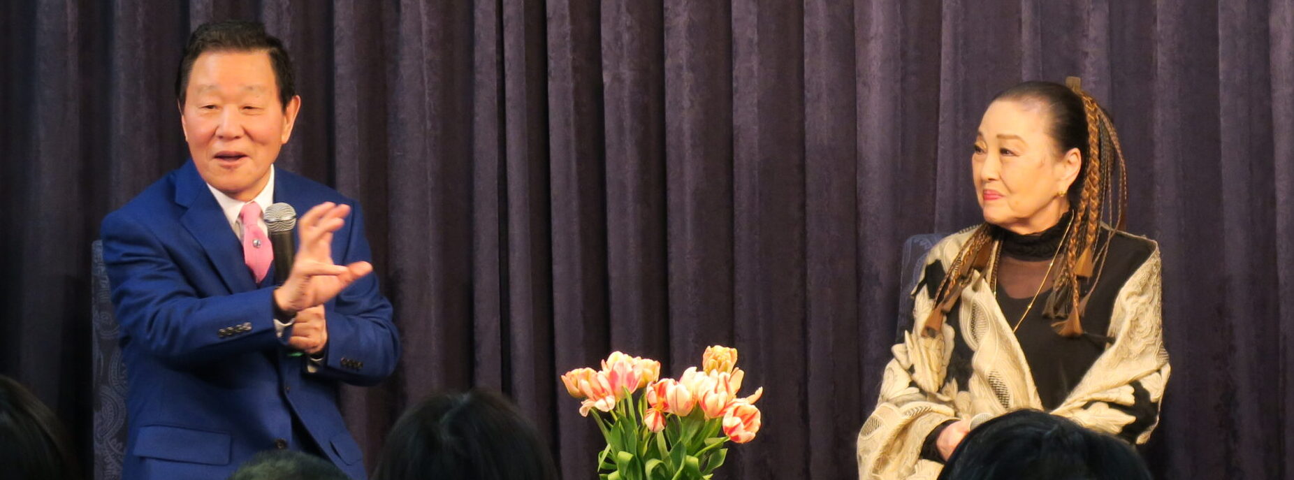 湯川と鬼無里氏は、「えっちゃん、お母さん」と呼び合う仲なのですが、「なぜ結婚したの?」という湯川の唐突な質問に、「私、アクションやってきたじゃないですか。怖いものが好きなのか、危険なものとか、命をかけそうなものがちょっと好きという傾向はあるのかな」と笑顔で答えられました。そして、「私、本当にね、結婚生活いろいろ大変だったんです。喧嘩しても、一度も手も足も出したことないんです。だって、向こうを商品だと思っているから、回し蹴りとか全部封印したの。1回だけ追い詰められた時に、この正拳、身を守るために1回あるぐらい。なのに、YouTubeで私がすっごい強くて、それで、彼は筋トレやり始めたとか…、全然違うのよ!」と明るくお話されました。対談後は歌とトークのワンマンショーです。
