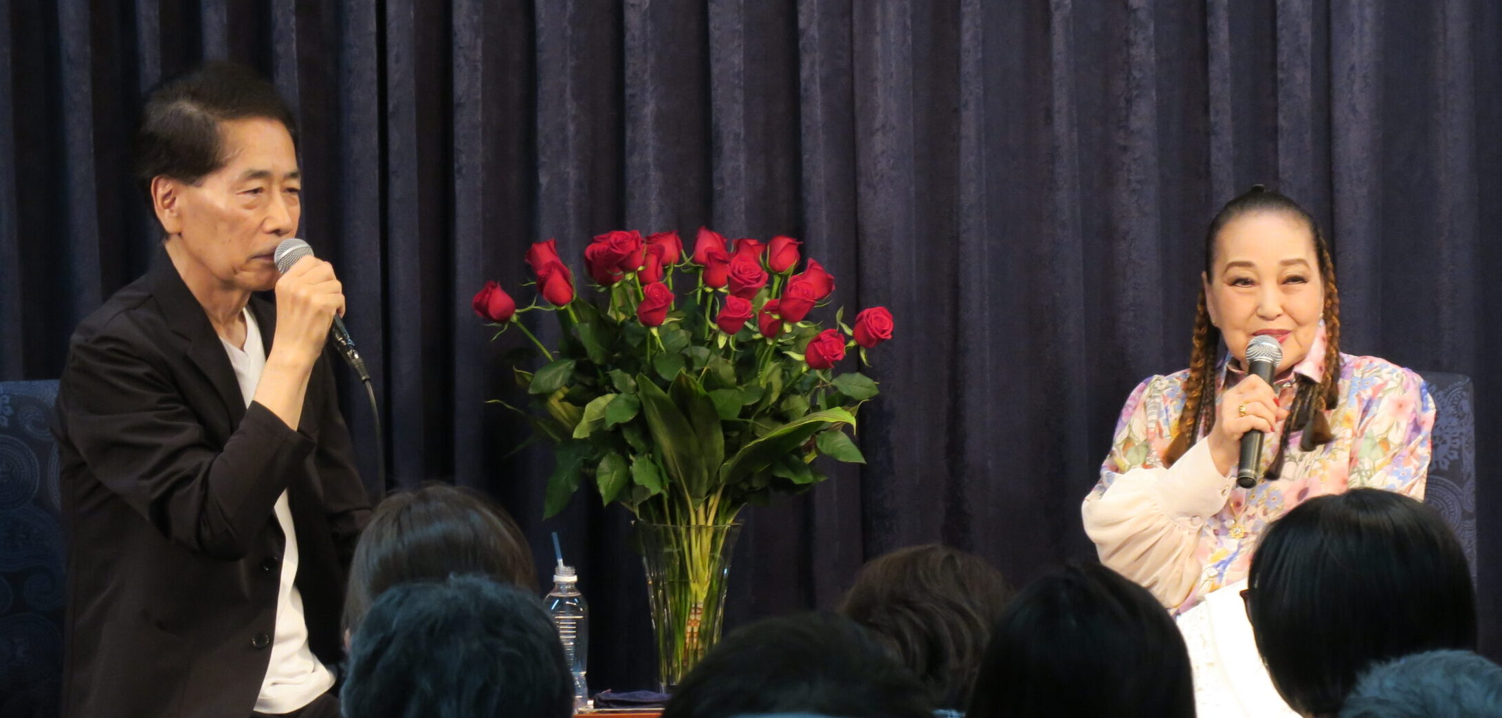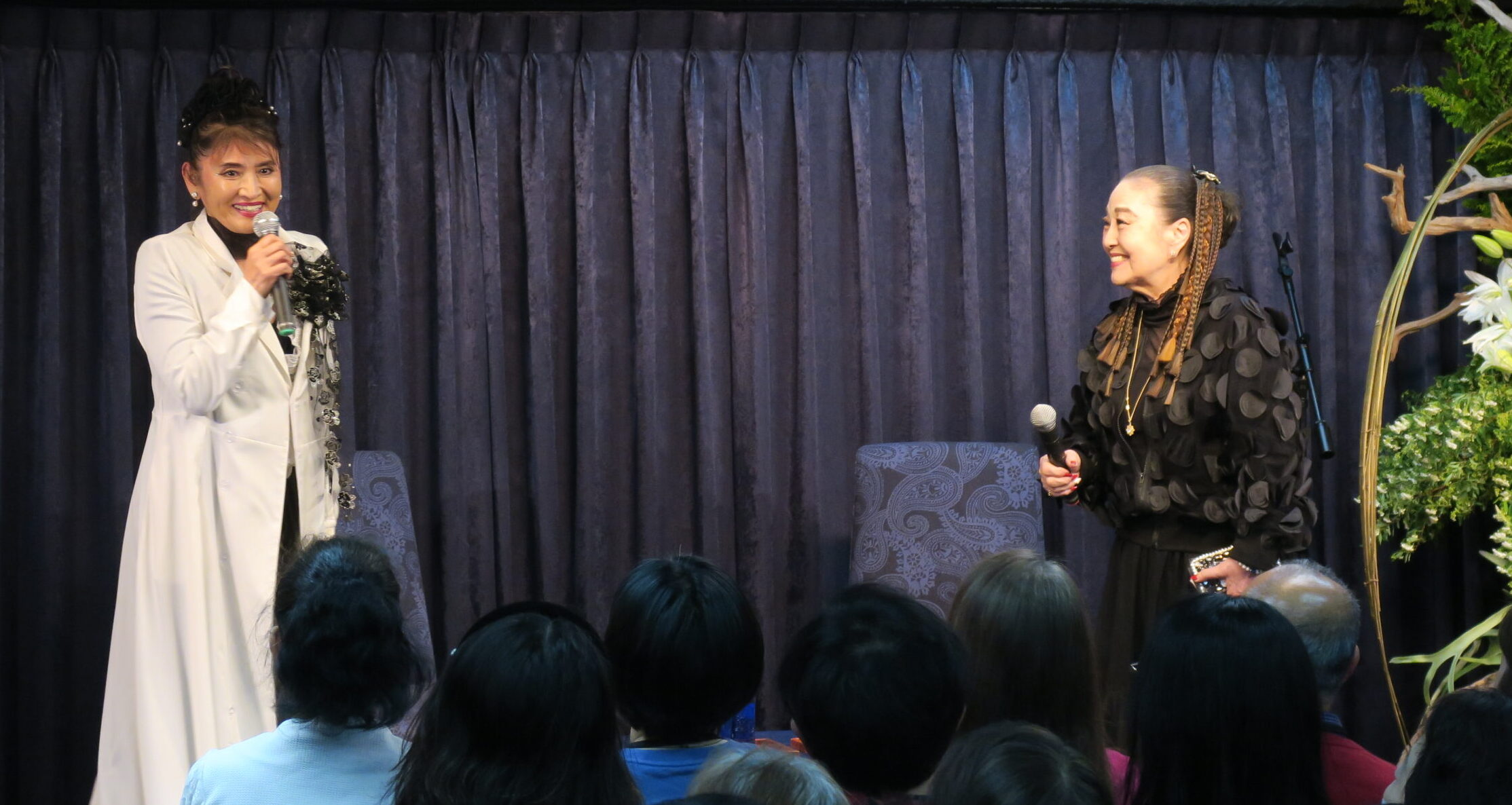 「鬼が無い里、これこそ平和の象徴のような感じがして、でも強さと美しさがあるなと思って。どの時代も鬼はいるんです。鬼って悪いものだけじゃなく、鬼子母神とか、すごいことをやる象徴です。そういう意味で三文字に惹かれました。昔女優をやっていたから歌うといった特権を使うという考えは、私の中には全くないんです。別人格として新しいことを始めたいし、そういう目で見てもらいたいし、本当に新人からスタートしたかったから、三文字がドーンと降りて来たんです。シャンソンが本当に好きで、この年になったら、いっぱい付いた傷が歌えるわ…とか思って。シャンソン、私、本当に心から愛しています。今思えば、全てを力に変えたいと思うので、シャンソンが教えてくれた、そして私の傷を癒してくれたものを今日は聞いて頂けたらと思います」と話されて、心を揺さぶる6曲を熱唱下さいました。会場内は魅了され、参加者の方々の涙を誘っていました。