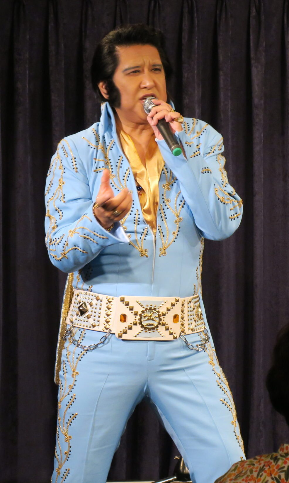 予告無しでお迎えしたサプライズゲスト、青森のプレスリーこと土岐豊一氏の登場です。頭のてっぺんから足先までエルヴィスそのものの出で立ちに、会場からは歓喜の声が上がりました。アメリカで開催されたエルヴィスそっくりさん世界大会で、なんと5位の方です。先ずは“Unchained Melody”、続いて土岐氏が大好きな“An American Trilogy”を、まるでエルヴィスの再来かのように歌って下さいました。勿論、会場からのアンコールの声もあって、エルヴィスの一番有名な曲“Can't Help Falling in Love”で締めて下さいました。「泣かされちゃった。幸せでした!有難うございました!」と湯川。終演後も会場内の熱気は冷めやらず。本当に湯川ならではのスペシャルな時空の一夜となりました。