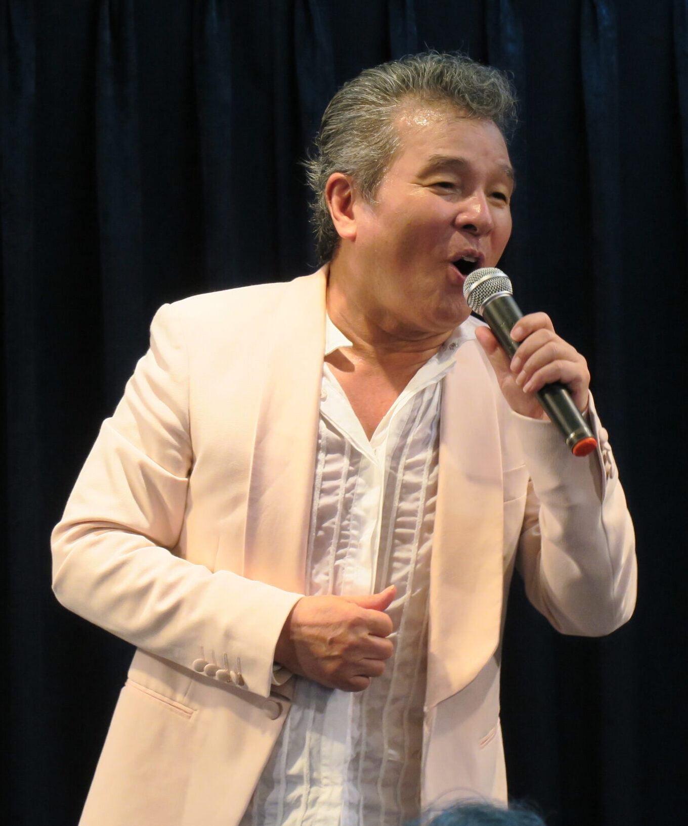 そして、尾藤イサオ・オン・ステージの開演です。“All Shook Up”“Teddy Bear”“Don’t be Cruel”をメドレーで、続いて代表曲“Heartbreak Hotel”を日本語歌詞を交えながら歌い、「昔はロカビリーで頑張っていました。今はリハビリで頑張っております」と笑いを誘い、“Hound Dog”“監獄ロック”で会場を興奮の渦で満たしました。アンコールは代表曲“あしたのジョー”、最初のヒット曲“悲しき願い”。湯川も会場の皆様も感極まっていました。尾藤氏が退場されて会場内は少し暗転。